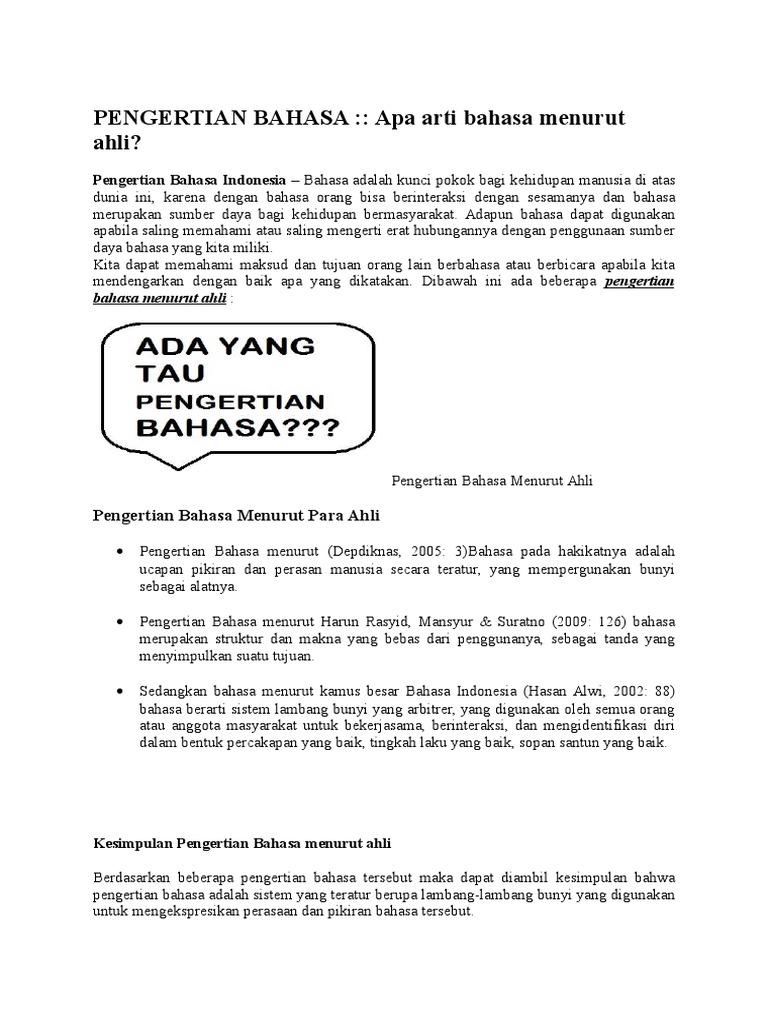 Untuk memahami lebih jauh tentang pengertian dan definisi bahasa, kita dapat lihat pendapat para ahli dibidangnya yang mengemukakan beberapa bahasa ialah sebuah sistem bunyi yang apabila digabung menurut aturannya akan menimbulkan arti yang bisa dipahami dan ditangkap oleh semua. Semoga bermanfaat dan bisa menambah wawasan. Pengertian pertama menyatakan bahasa sebagai alat komunikasi antara anggota masyarakat berupa simbol bunyi yang dihasilkan oleh alat ucap manusia. Selain pengertian bahasa secara umum, para ahli dan pakar memiliki pendapat dan pandangan yang berbeda beda dalam mendefinisikan apa itu bahasa. Pengertian literasi menurut para ahli. Nawawi dan martini menjelaskan bahwa observasi merupakan kegiatan mengamati, yang diikuti pencatatan secara urut. Bahasa yang baik berkembang berdasarkan suatu sistem, yaitu seperangkat aturan yang dipatuhi oleh pemakainya. Bahasa adalah sistem lambang bunyi ujaran yang digunakan untuk berkomunikasi oleh masyarakat pemakainya. Bahasa adalah sistem simbol bunyi yang bermakna dan berartikulasi (dihasilkan oleh alat ucap) yang bersifat arbitrer dan konvensional, yang dipakai sebagai alat berkomunikasi oleh sekelompok manusia untuk melahirkan perasaan dan pikiran. Pengertian bahasa menurut para ahli. Supaya lebih memahami mengenai apa itu arti bahasa, maka kita dapat merujuk pada beberapa pendapat yang nah itulah penjelasan mengenai pengertian bahasa, fungsi, manfaat, menurut para ahli, semoga apa yang dipaparkan diatas, dapat. Bahasa adalah sebuah ucapan yang berasal dari perasaan serta pikiran manusia yang disampaikan secara teratur dan dengan memakai bunyi sebagai mediumnya. Sebelum kita melihat penjelasan dari para ahli, terlwbih dahulu kita simak pengertian ilmu secara bahasa, secara istilah, dan secar umum, berikut.